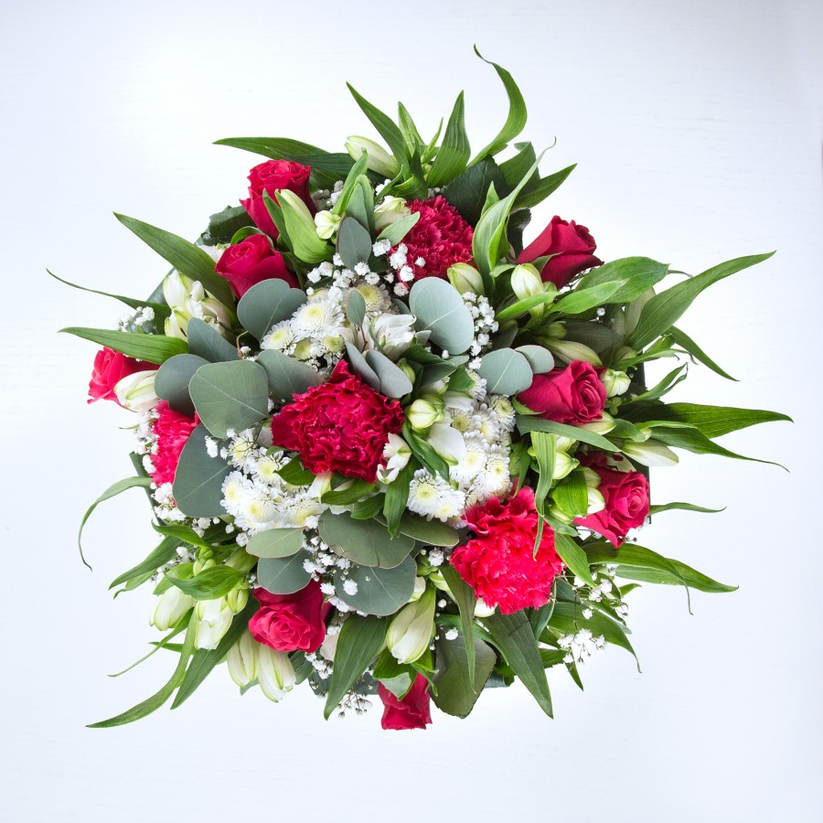 Our Luxurious Bloom Collection is a heartwarming display of nature’s finest offerings. Expertly arranged, it features a blend of tender white chrysanthemums, ethereal gypsophila, velvety red roses, and vibrant carnations, intermingled with soft white alstroemeria and rich aspidistra leaves. Each stem is meticulously hand-selected for its freshness and quality.